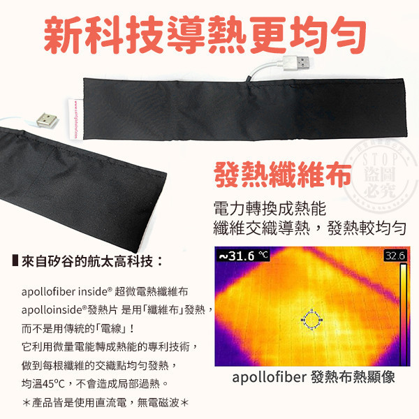 - apolloinside®專利纖維布發熱技術,均溫45°C,安全無電磁波。