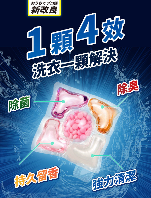 - 三效合一:洗衣精+柔軟劑+除臭劑,一顆搞定不沾手。