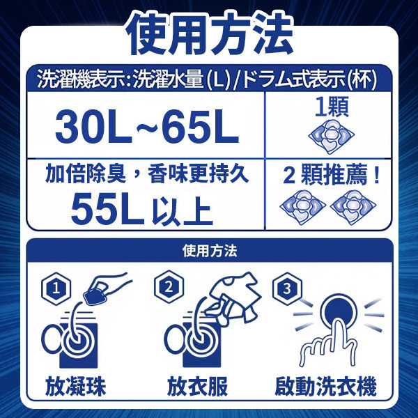 - 使用方式:取一顆放入洗衣槽,無需再加洗劑