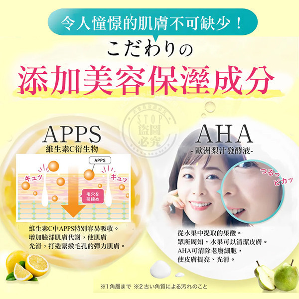 - 主要成分:APPS維生素C衍生物、AHA歐洲梨汁發酵液、美容保濕精華